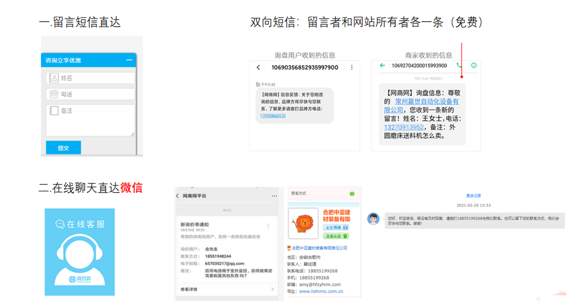- 7、多种询盘工具(微信客服系统、短信双向通知、一键拨号)